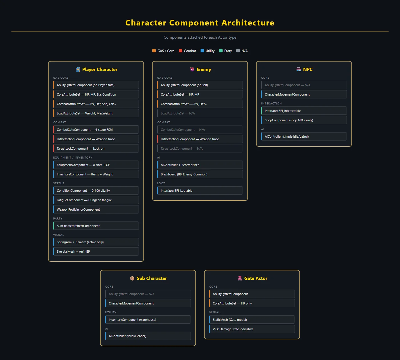 Player、Enemy、NPC、SubCharacter、GateActor別のコンポーネント搭載図。