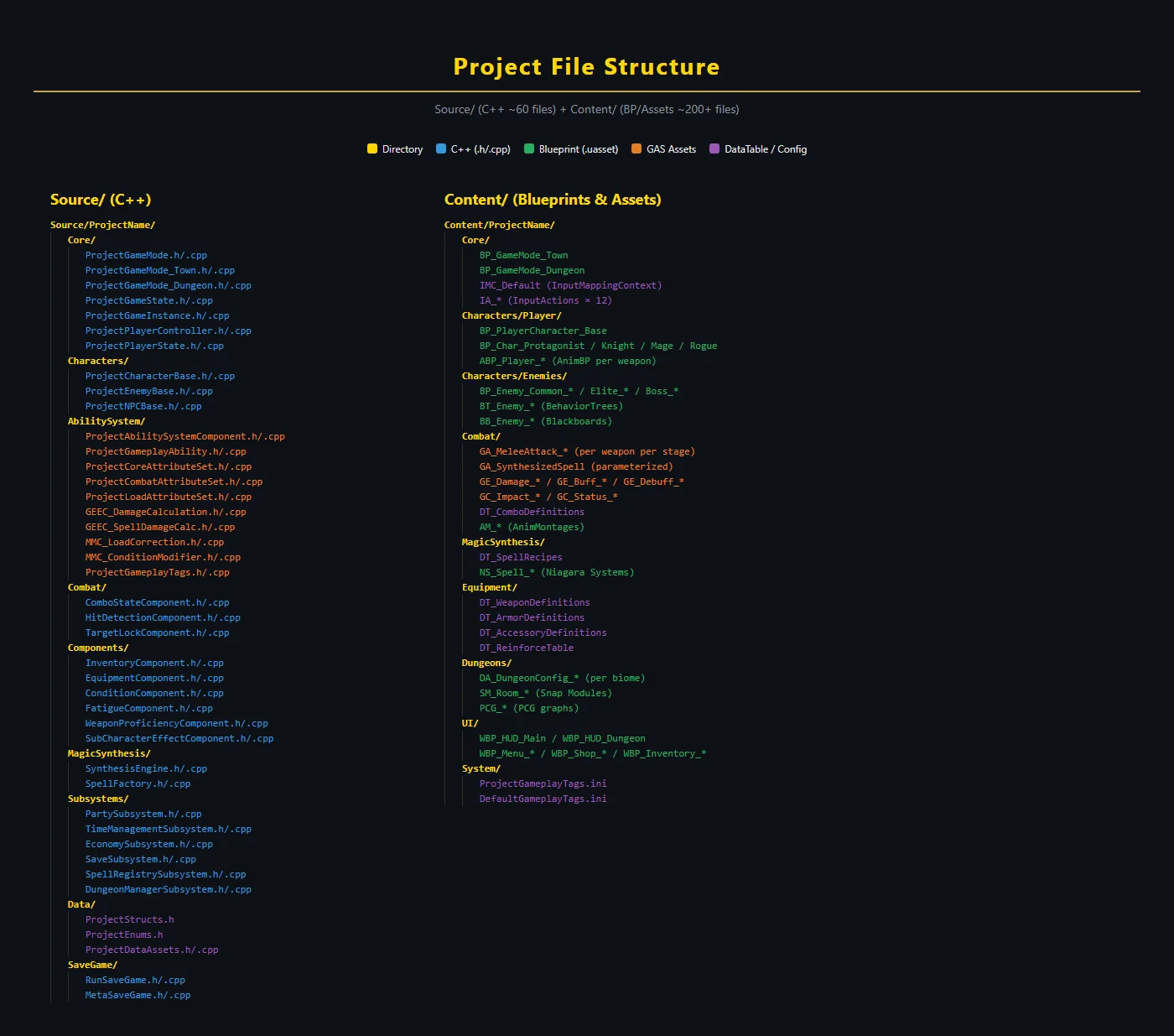 Source/(C++ ~60ファイル)と Content/(BP ~200+ファイル)のビジュアルツリー。