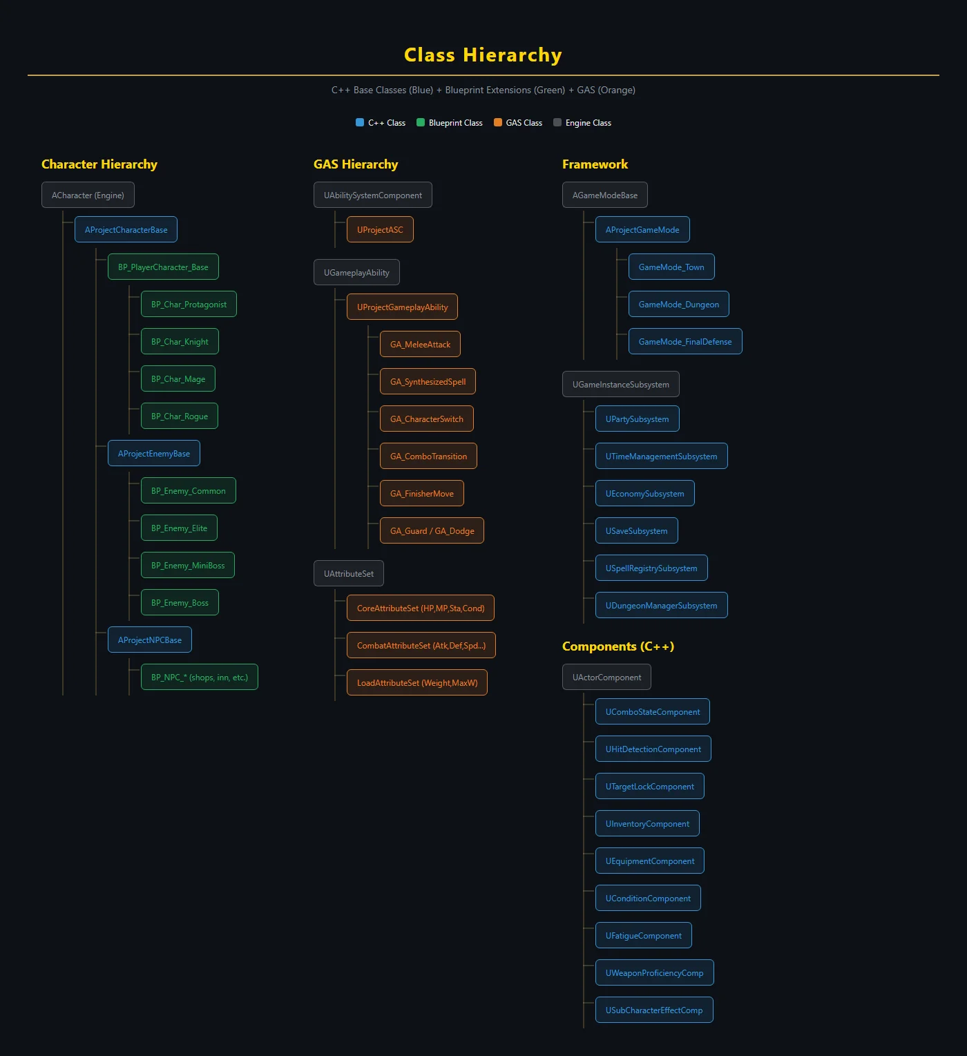 AProjectCharacterBase(C++基盤)→ BP_PlayerCharacter_Base → BP_Char_*AProjectEnemyBase(C++基盤)→ BP_Enemy_Common / Elite / Boss