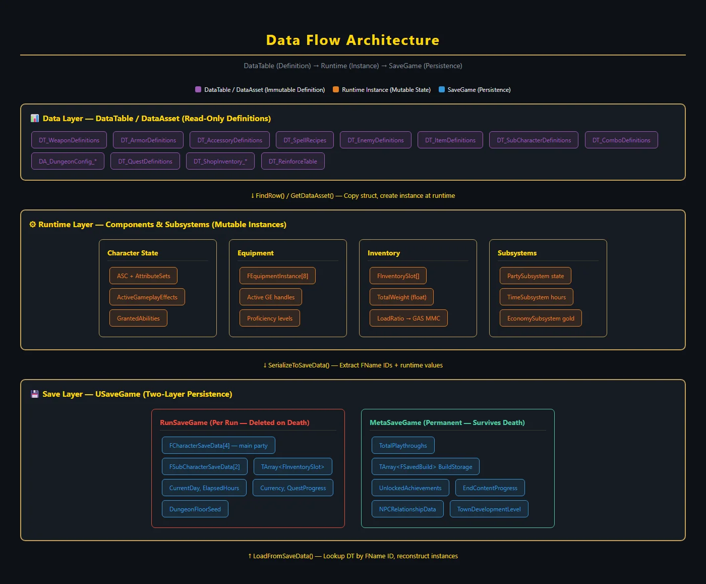 セーブシステム — アーキテクチャ¶ 二層設計¶ レイヤー 永続性 内容 RunSaveGame 死亡で消去 キャラデータ、装備、インベントリ、時間、通貨、クエスト MetaSaveGame 永続 周回数、ビルド保存、実績、エンドコンテンツ進行、NPC関係 非同期セーブ¶ AsyncSaveGameToSlot を必ず使用(同期セーブ禁止 → フレーム落ち防止)。 関連画面¶ 自宅 ビルド保存 ビルド倉庫